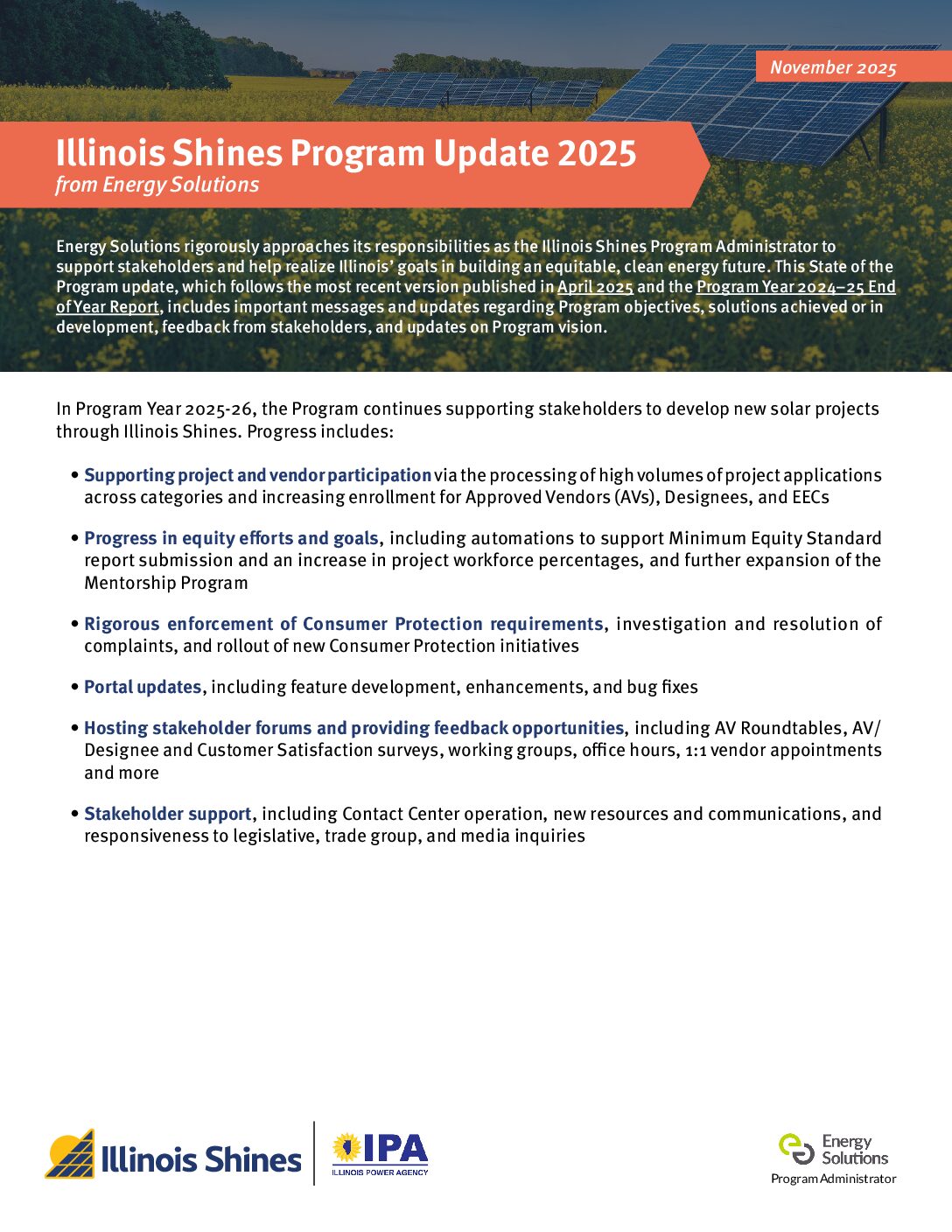Each Program Year brings continued progress and growth to Illinois Shines, through collaboration between Stakeholders, the Illinois Power Agency, and Energy Solutions, the Illinois Shines Program Administrator.