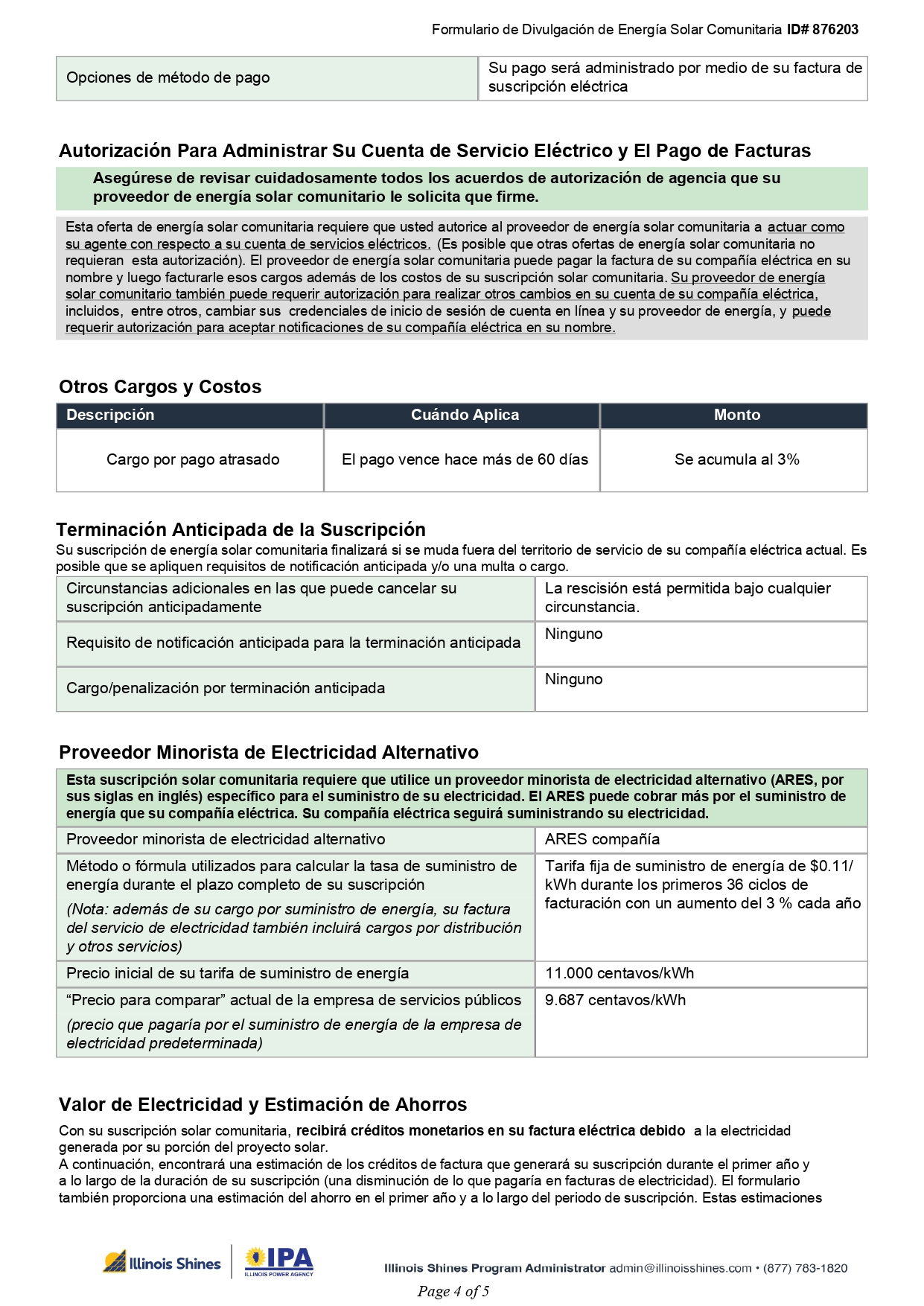 Si compra electricidad de una ARES, seguirá recibiendo créditos de ComEd por su suscripción a energía solar comunitaria, calculados según el Precio Comparativo de la compañía eléctrica (que puede ser diferente al precio que paga por la electricidad a la ARES). Si recibe una sola factura de electricidad de ComEd, los créditos de energía solar comunitaria se aplicarán a toda la factura. Si recibe facturas separadas de ComEd y de la ARES, los créditos de energía solar comunitaria solo se aplicarán a la factura de ComEd. Si recibe una sola factura de la ARES, los créditos de energía solar comunitaria se aplicarán a los cargos de ComEd en la factura.