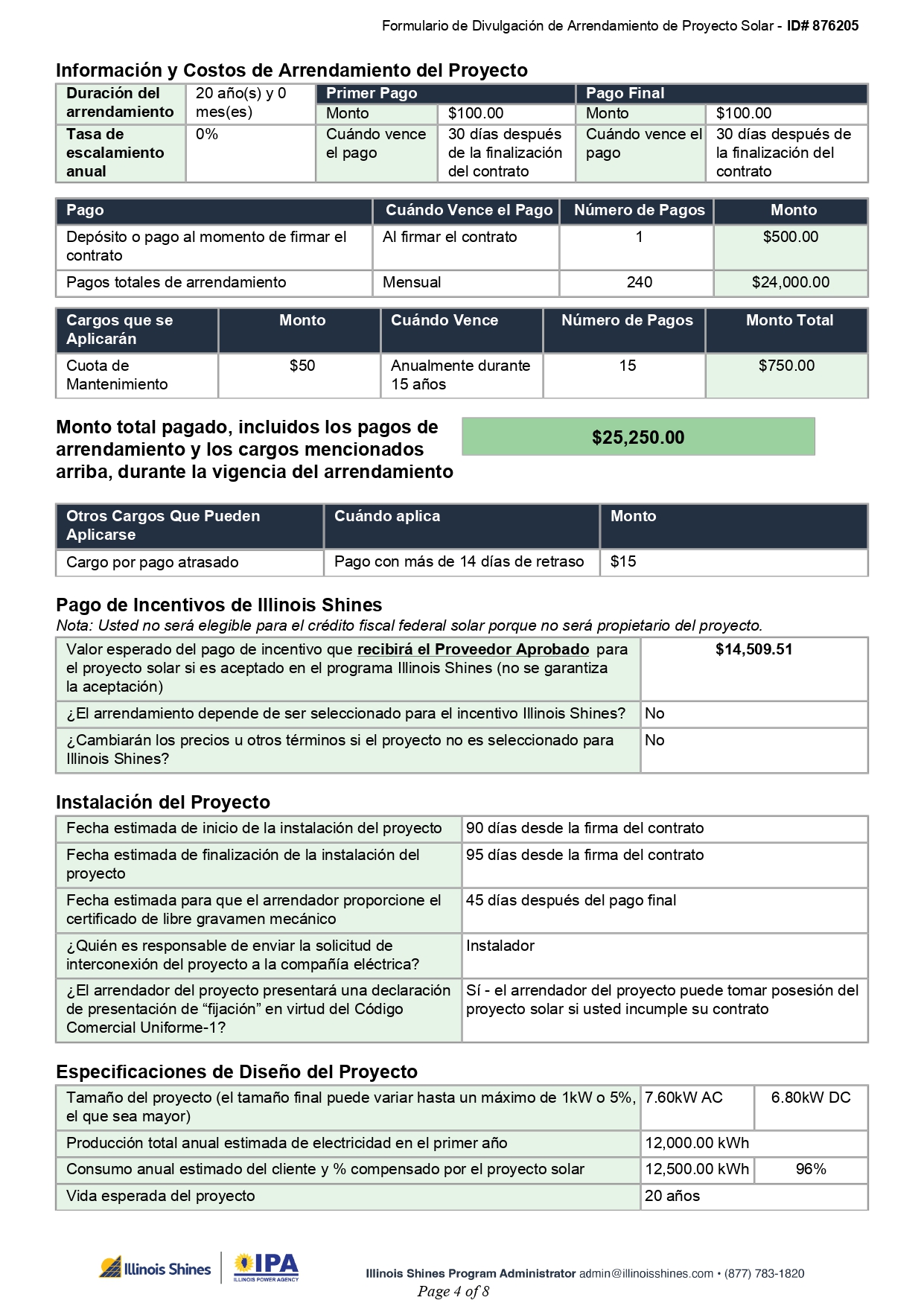 Illinois Shines no limita los precios ni las tarifas de arrendamiento de proyectos solares. Si tiene alguna pregunta o inquietud sobre los costos o las tarifas, consulte con su empresa de ventas. También puede contactar a otros proveedores y representantes autorizados para comparar presupuestos.