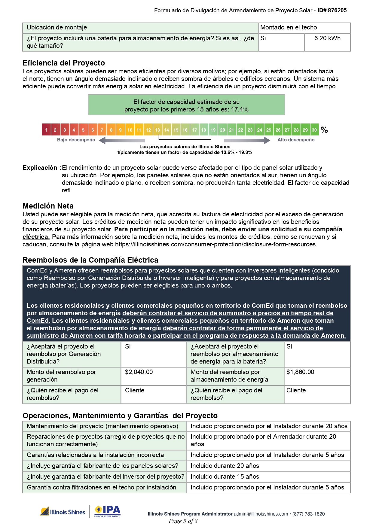 El Formulario de Divulgación detalla la vida útil prevista del proyecto. Los módulos de paneles solares se degradan con el tiempo y su vida útil depende de la tasa de degradación. La tasa de degradación se refiere a la velocidad a la que los paneles solares disminuyen su capacidad de producir electricidad con el tiempo. Para obtener información sobre la vida útil, comuníquese con la empresa de ventas o el fabricante del equipo.